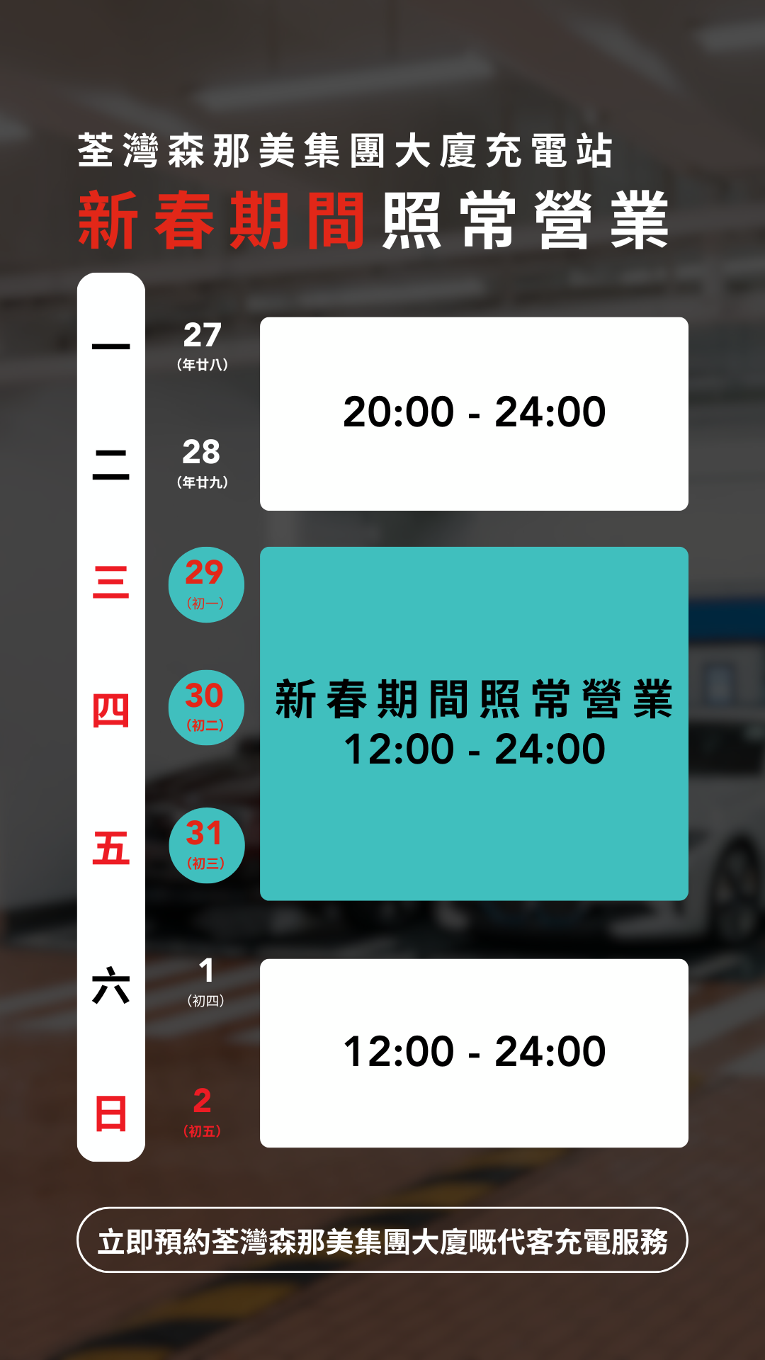 新春期間,荃灣森那美集團大廈的代客充電服務照常營業: