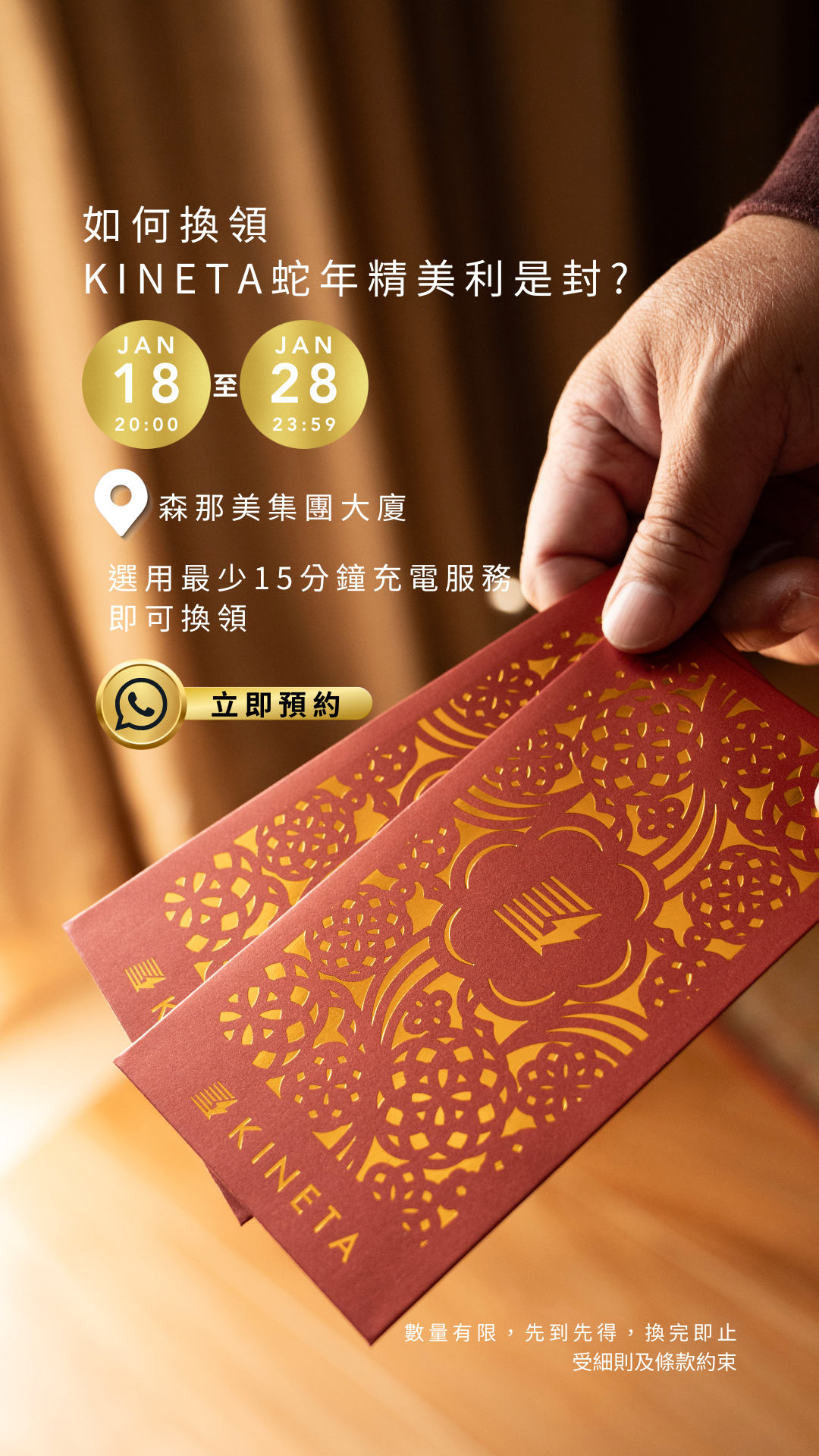 From 20:00 on January 18, 2025, to 23:59 on January 28, 2025 (inclusive), SD Charging member who enjoy at least 15 minutes of valet charging service at Sime Darby House, Tsuen Wan,  can redeem a beautiful set of KINETA red packets to celebrate the Year of the Snake.